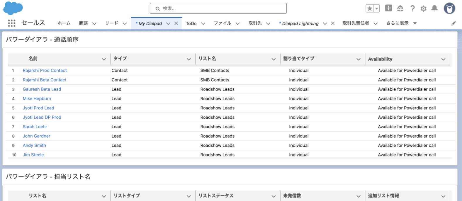 Salesforce の [My Dialpad] タブより、パワーダイアラリストの割り当てを確認できます。このリストでは、エージェント各自に割り当てられたパワーダイアラリストの対応順序などを確認できます。このページでは、エージェントは自分に割り当てられたリストを確認できます。