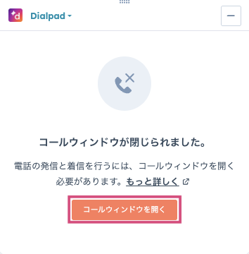 [コールウィンドウを開く] をクリックしても、HubSpot の通話機能が有効にならない場合は、カスタマーサービスにご連絡ください。