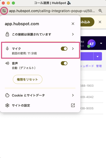 相手の声が聞こえない、または相手に自分の声が聞こえない場合は、HubSpot にマイクの使用許可が付与されているかご確認ください。