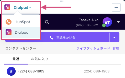 Dialpad の通話ウィジェットを使って、HubSpot 上で通話の発着信が可能です。
