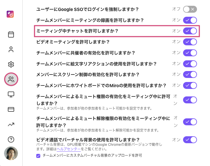 2. [ミーティング中チャットを許可しますか?] のトグルをオンにします。