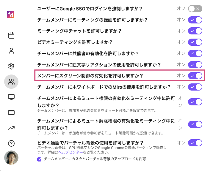 2. [メンバーにスクリーン制御の有効化を許可しますか?] のトグルをオンにします。