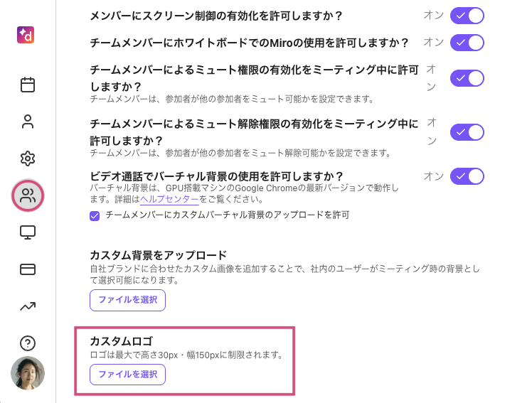 管理者は、チームのミーティングダッシュボードやミーティング中の画面に表示される会社ロゴをアップロードできます。