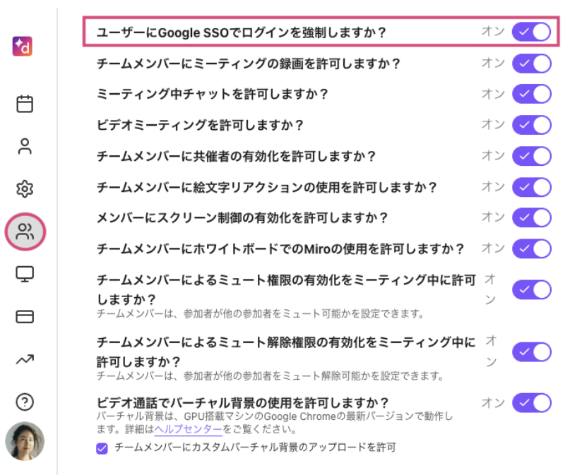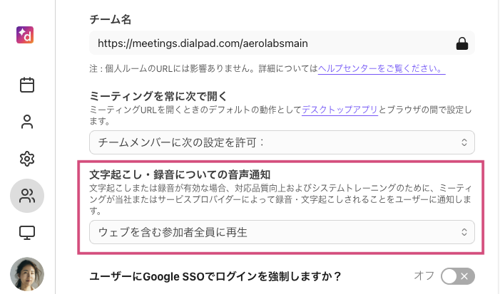 管理者は、チームメンバー向けに Google シングルサインオンを有効にすることができます。この設定を有効にすると、ユーザーは Dialpad Meetings アカウントにアクセスする際に Google SSO でサインイン・サインアップする必要があります。