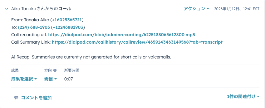 通話が HubSpot に記録されると、以下の情報がコール活動のメモとして含まれます: