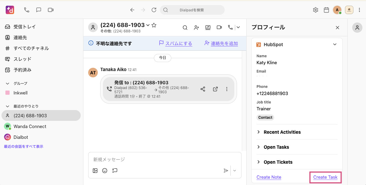 HubSpot の連絡先が電話番号に割り当てられた後は、HubSpot ウィジェットを使用して、HubSpot に記録され、Dialpad に表示されるタスクを作成できます。