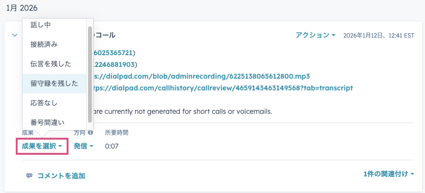 HubSpot の通話結果は、Dialpad の通話タイプに基づいて自動更新されません。