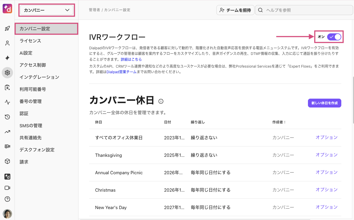 IVR ワークフローは、カンパニーレベルで有効化する必要があります。