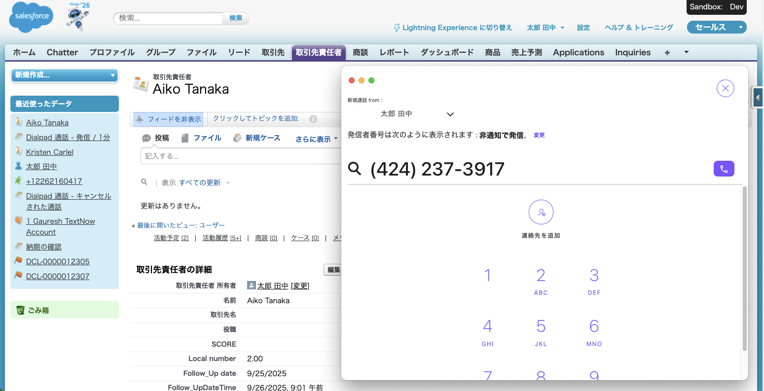 本機能は Salesforce 内のリード、取引先、商談から直接利用するため、自動的に通話記録が情報と関連付けられます。