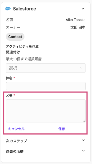 Salesforce にメモを残す場合、管理者に連絡しSalesforceとの連携機能を有効化してもらってください。